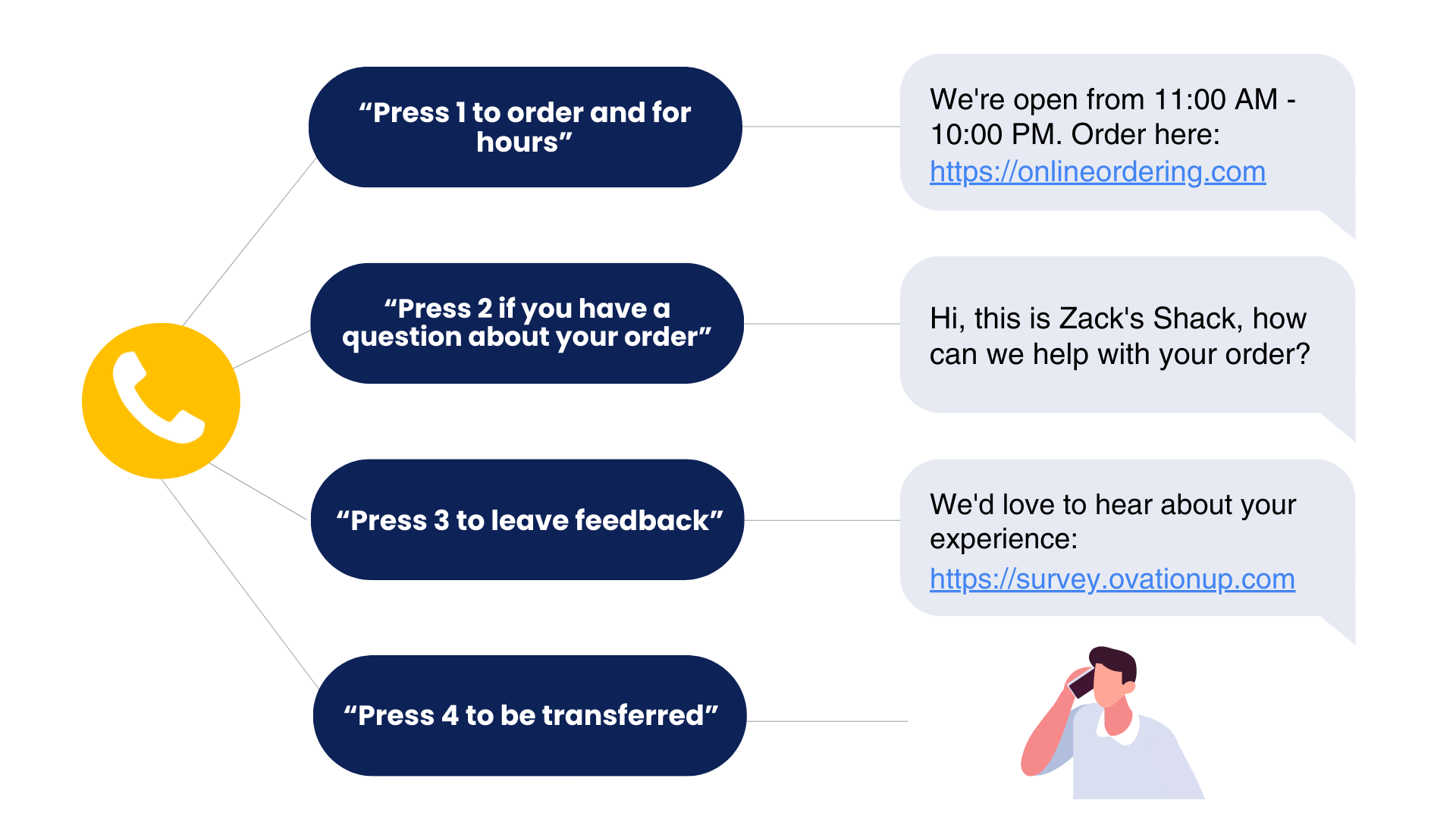 PDQ implemented Call-to-Text, a customizable phone tree that immediately texts callers with requested info, while collecting feedback and seamlessly integrating with Ovation.
